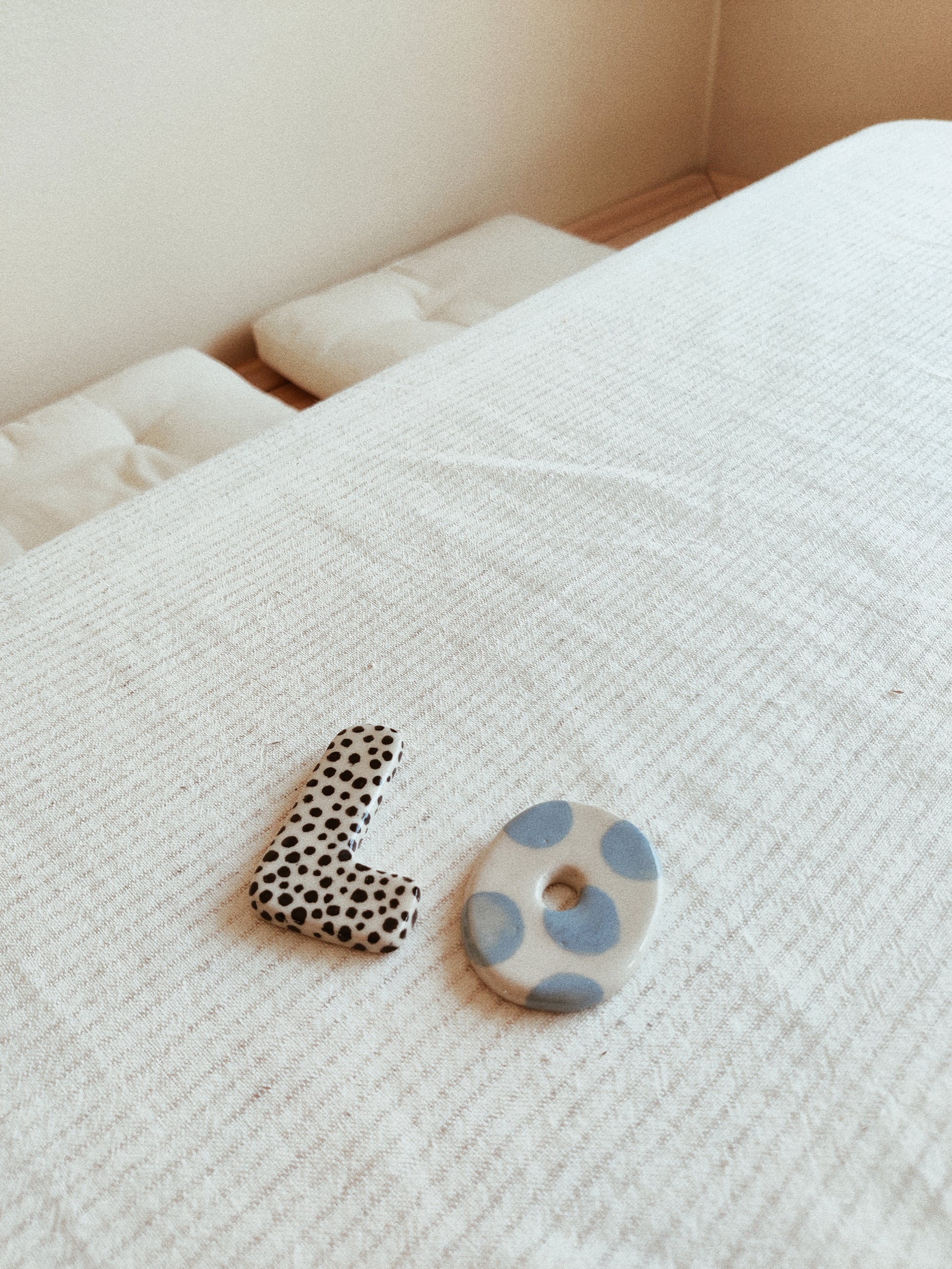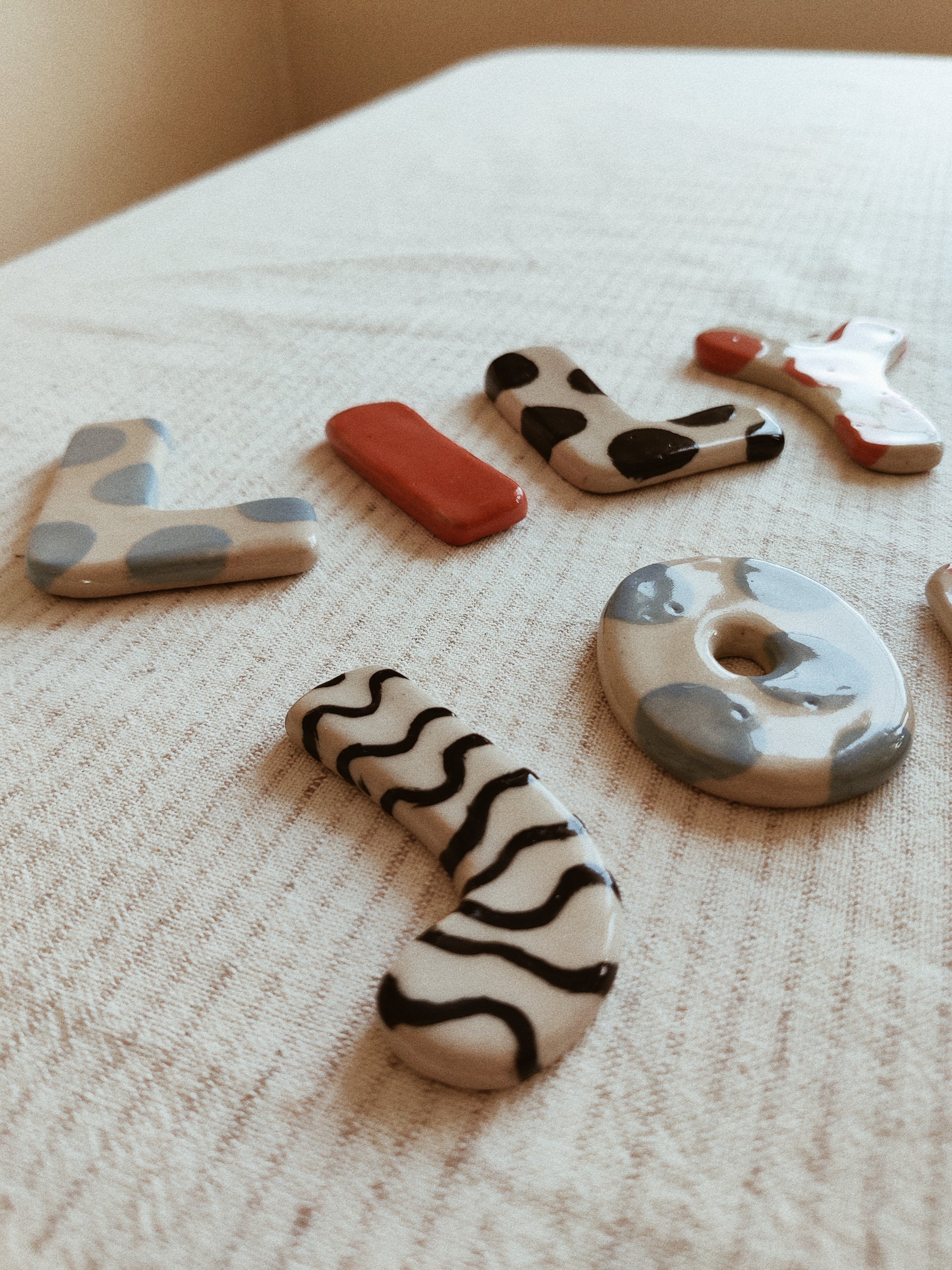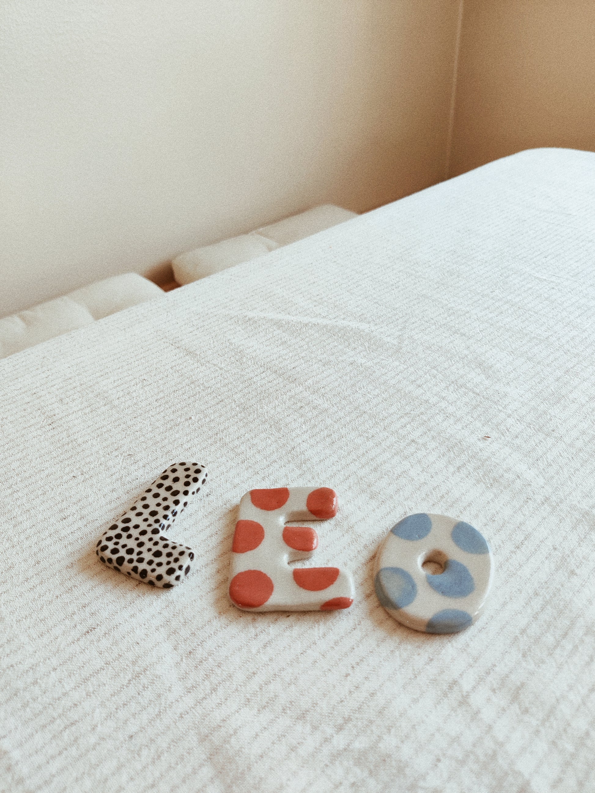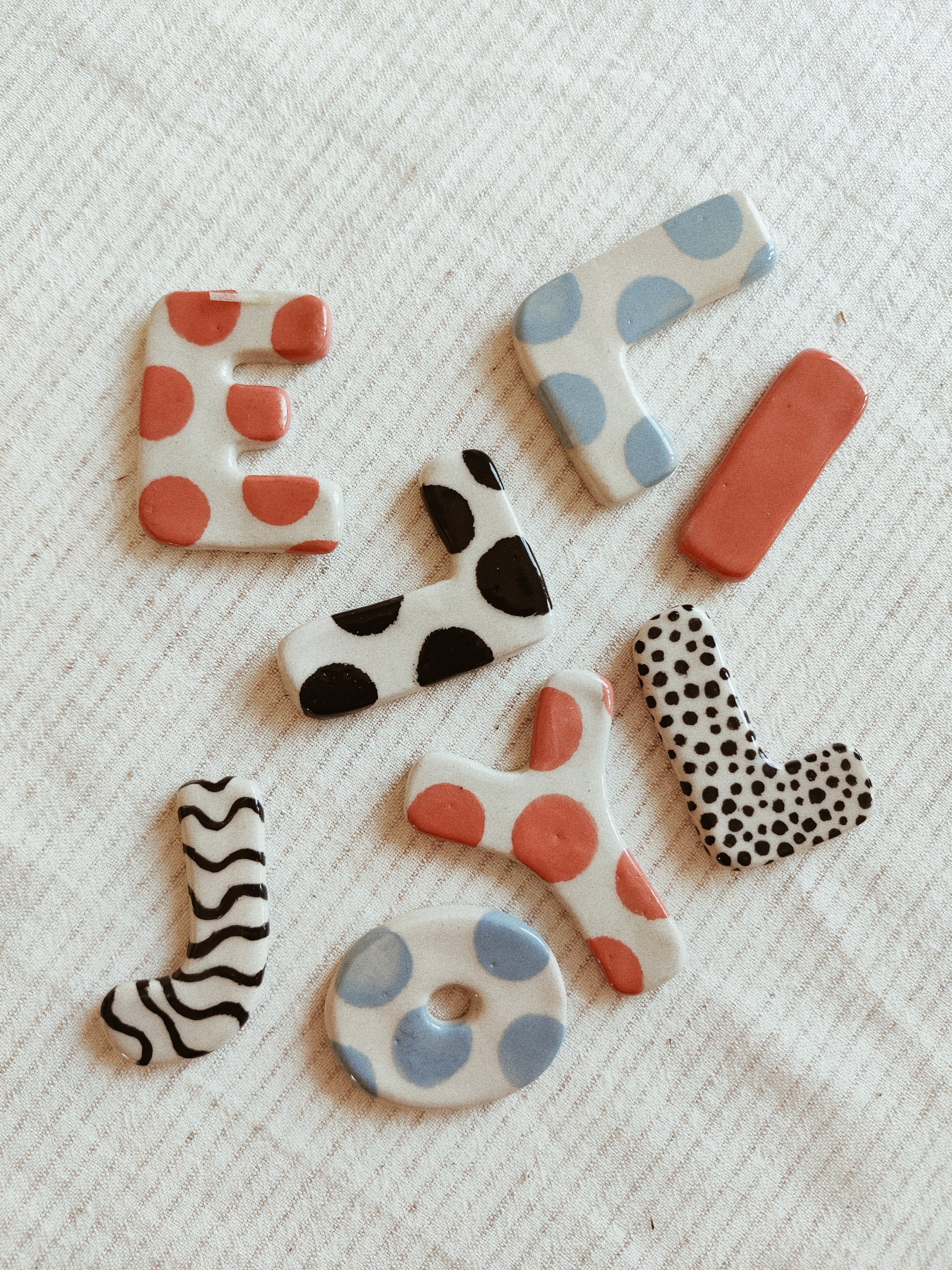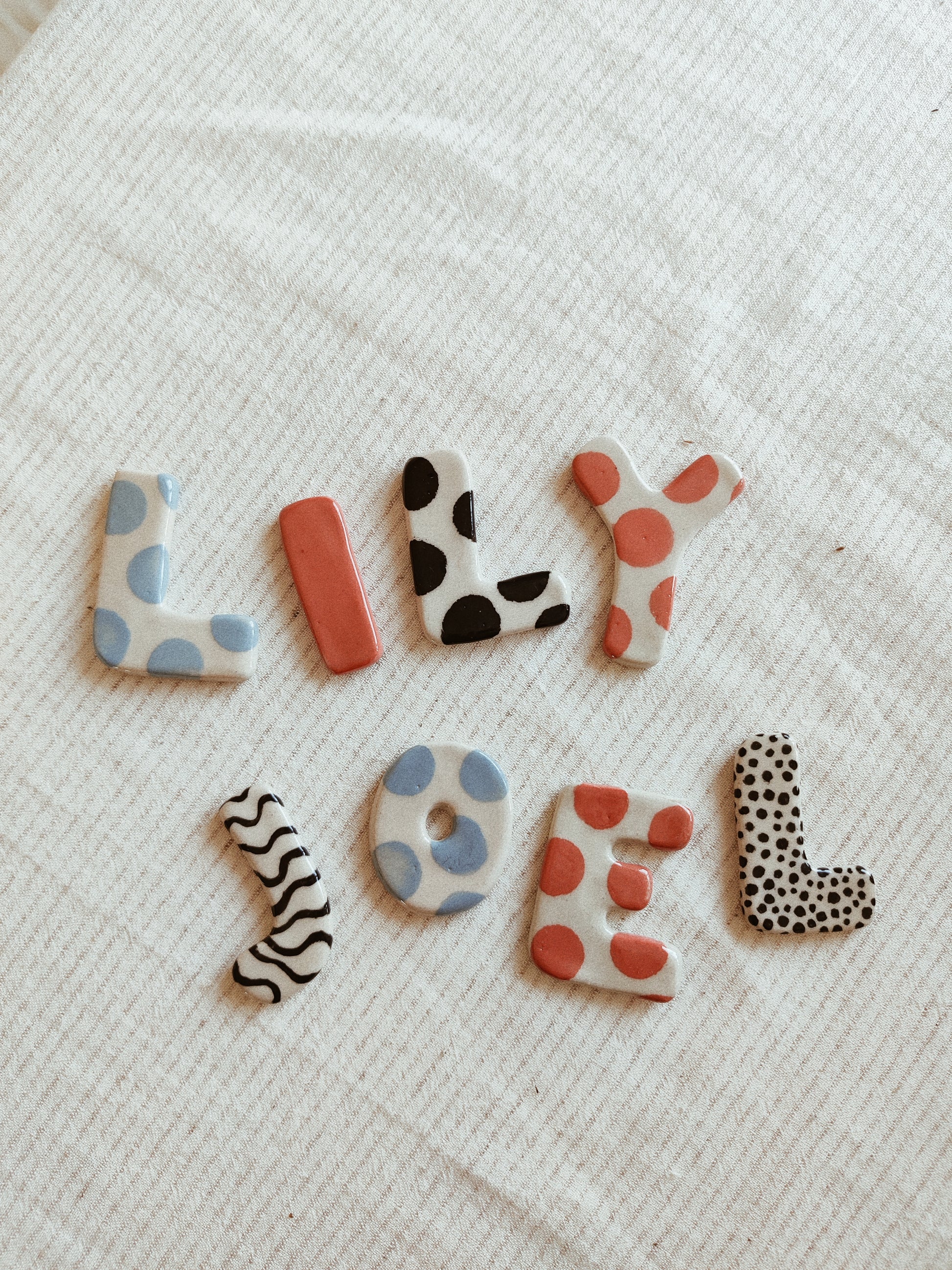 Bokstäver kavlade och utskurna ur vit lera. Varje bokstav är tillverkad helt för hand, dekorerad med engobe och glaserad med transparent glasyr.