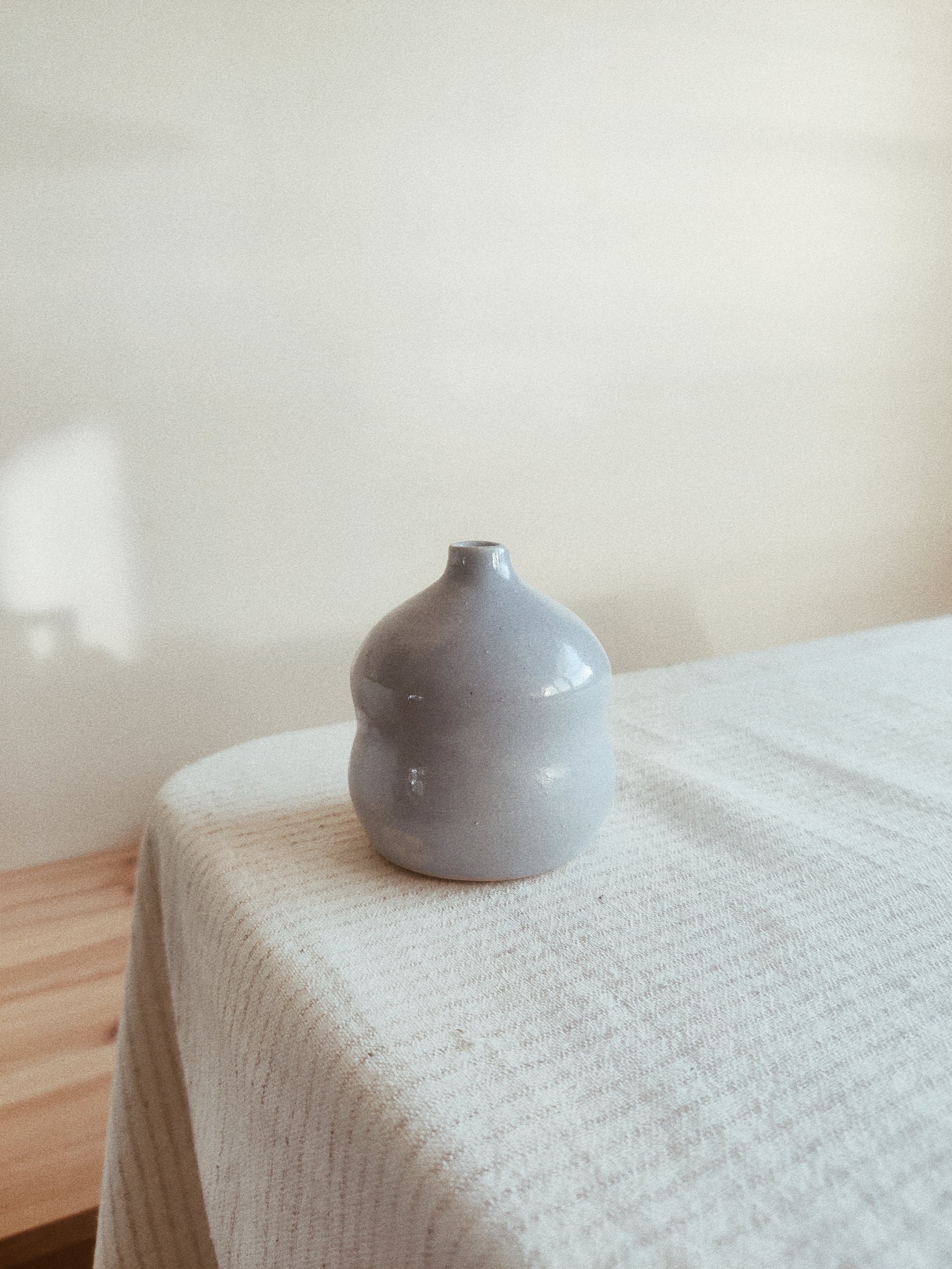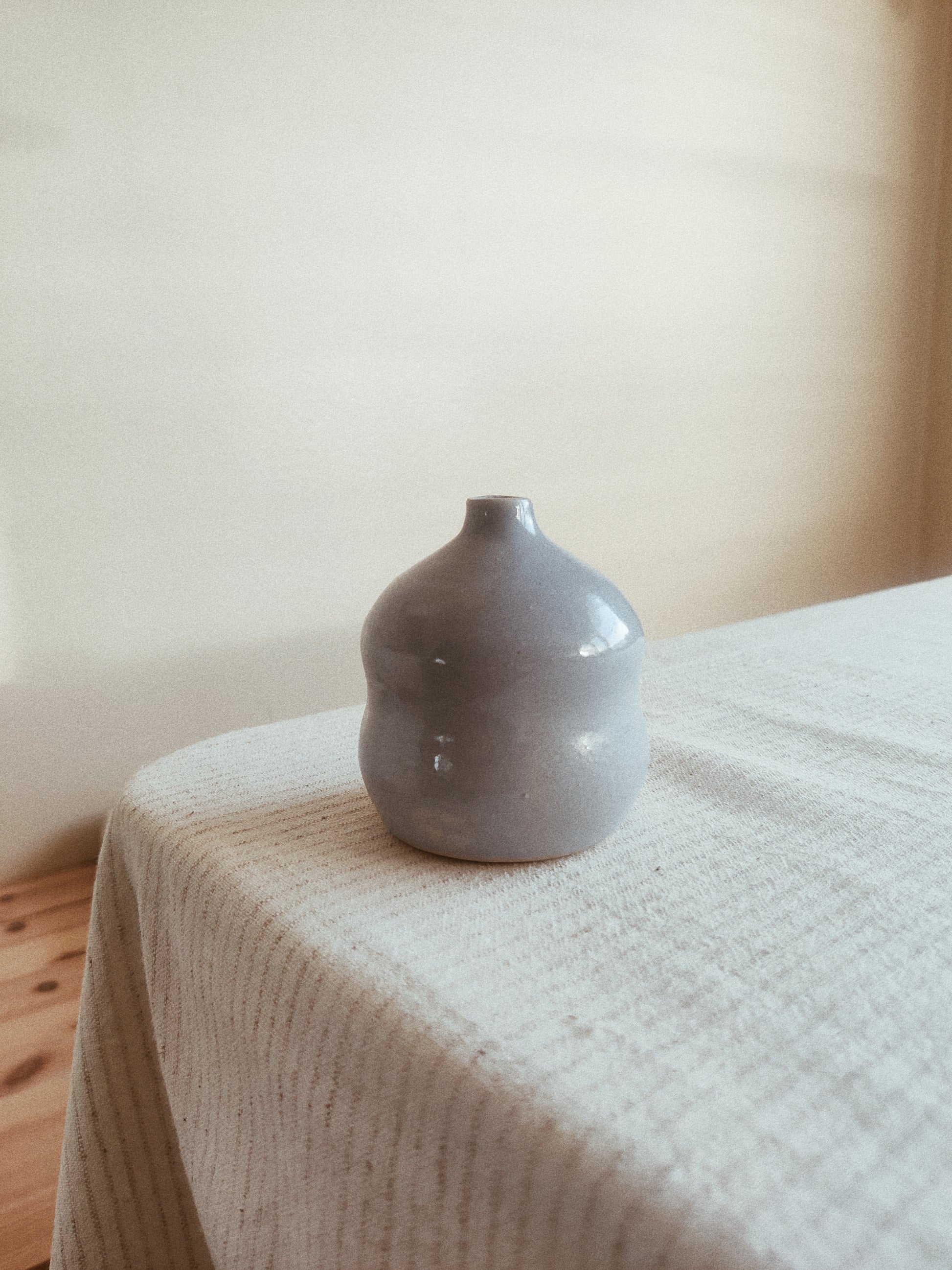 Liten vas drejade i beige lera. Glaserad i lavendelblå glasyr.