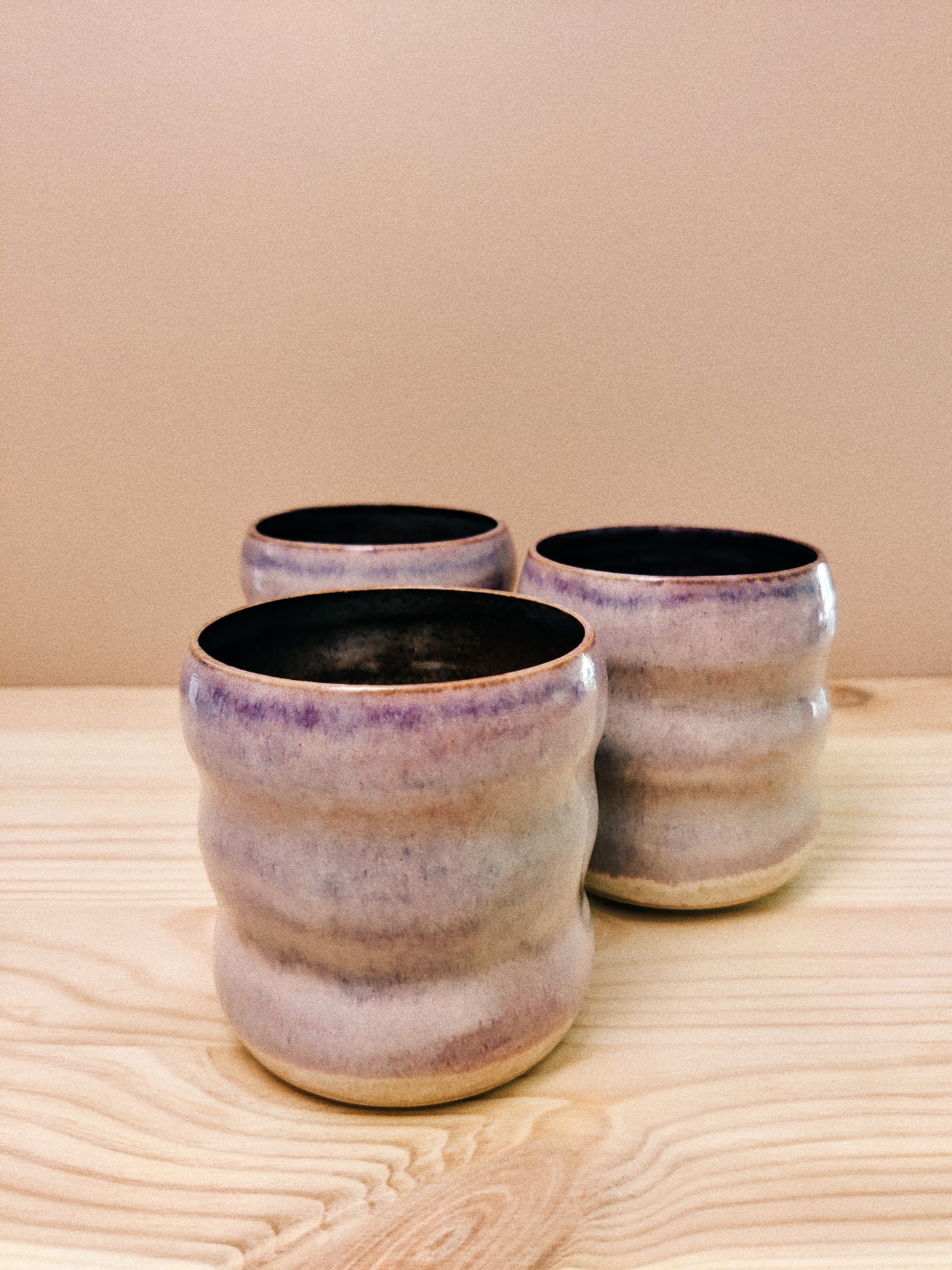 Vågmuggar drejade i vit lera. Glaserad med lila glasyr, på utsidan mixad med flux vilket ger en ljusare, mjukt marmorerad effekt, samt mörkare ton på insidan. Muggarna rymmer cirka 2,5 dl. Säljes styckvis, finns totalt 3 stycken.