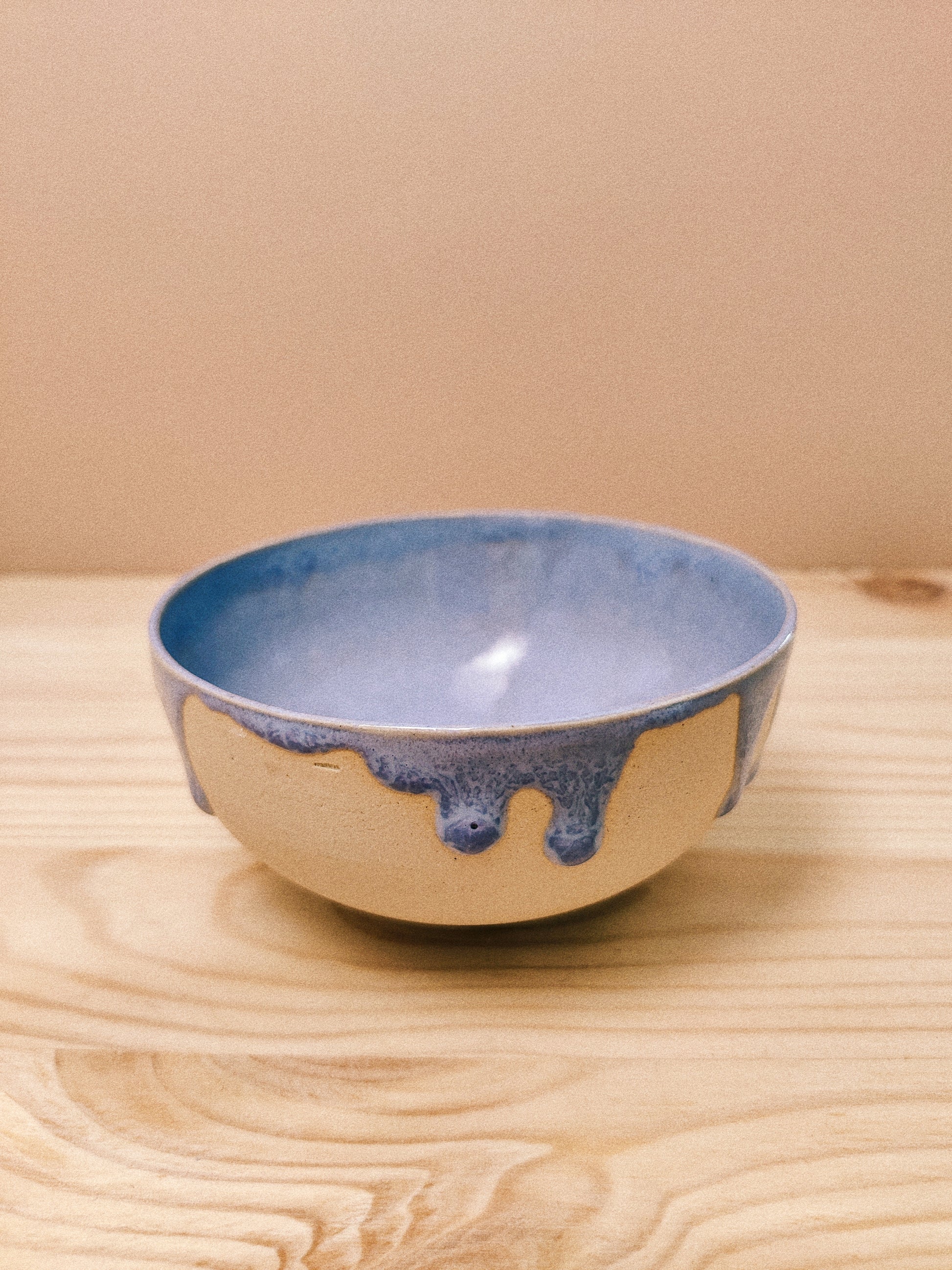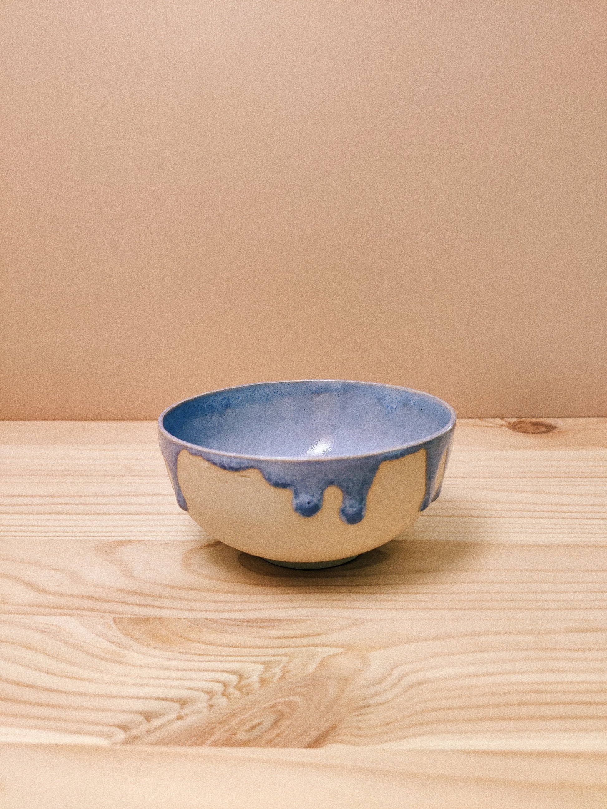Liten skål drejad i vit lera. Glaserad på insidan med härligt pastellig glasyr i lavendellila ton och med droppar längs kanten, rå utsida. Skålen rymmer cirka 1,5 dl och funkar perfekt för lite karameller eller vindruvor, eller varför inte som en liten matskål.