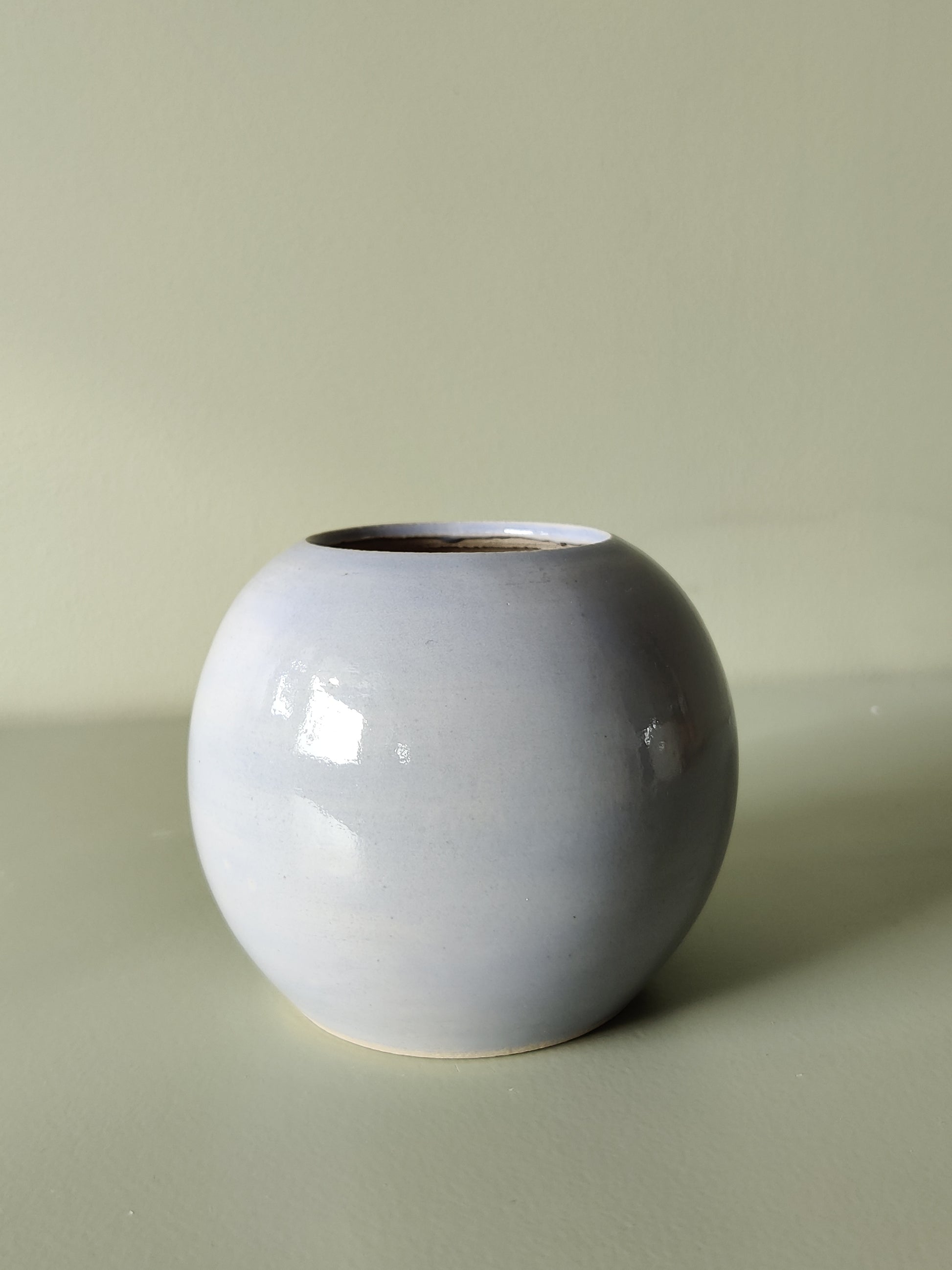 Rund och go vas (eller kanske kruka?) drejad i vit lera. Glaserad med härligt pastellig glasyr i ljust blålila ton på vit botten. Mäter cirka 12 cm i diameter.