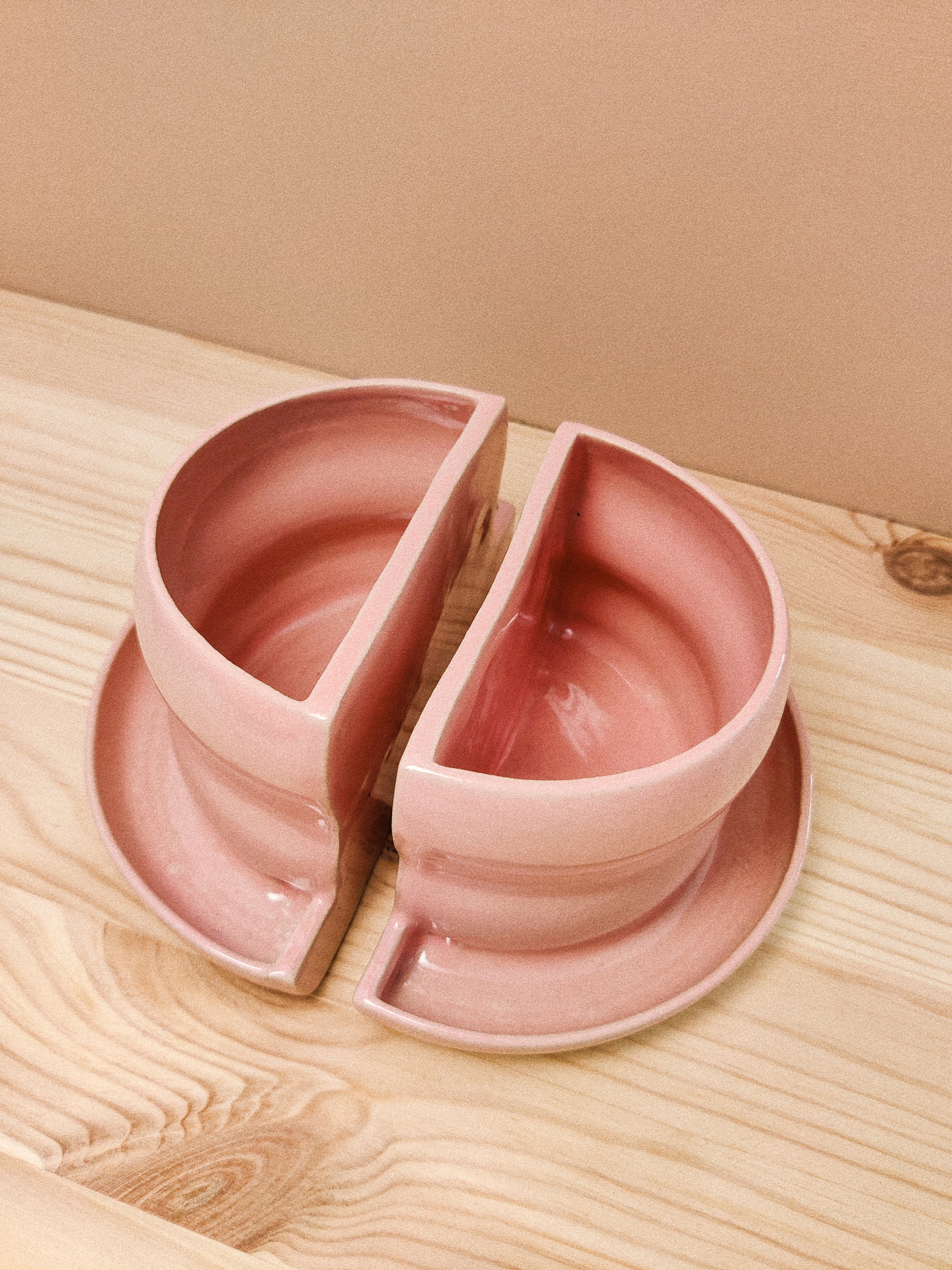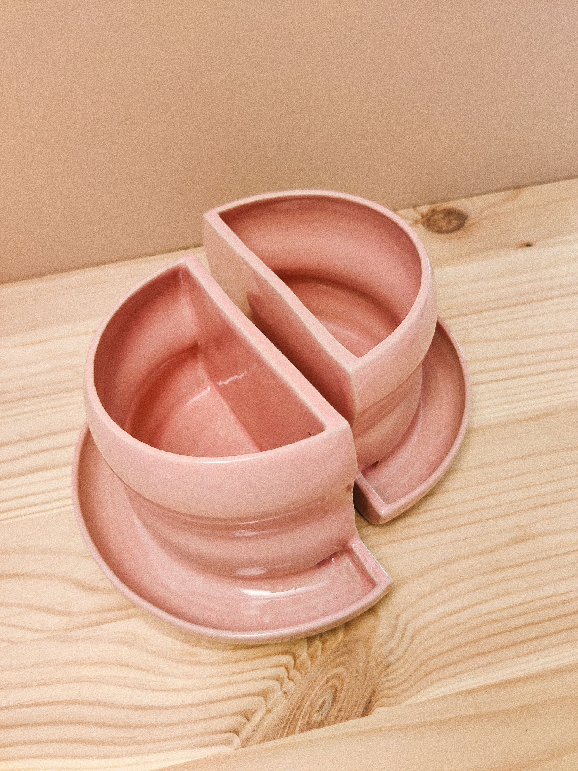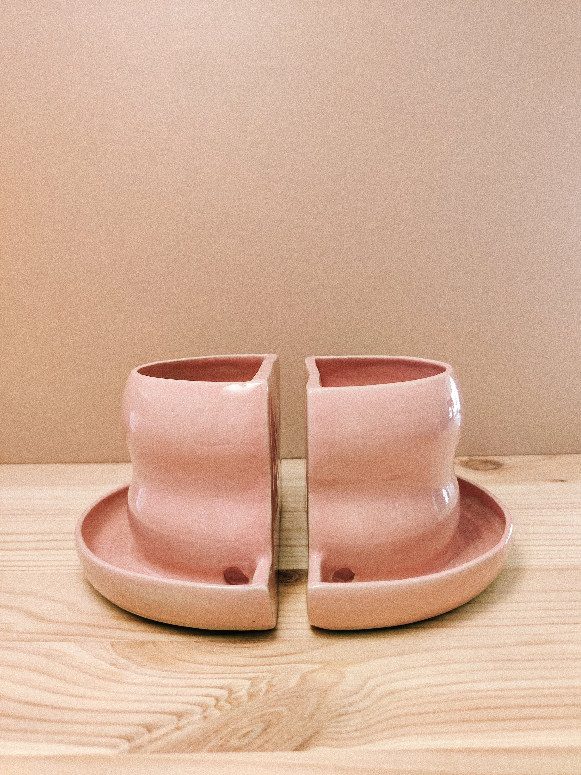 Unika bokstöd drejade i vit lera. Glaserad med härligt pastellig glasyr i en ljust rosa ton. Bokstödet fungerar också som kruka och är försett med avrinningshål för vattning. Fungerar fristående för de flesta små till mellanstora böcker. Obs. Säljs i par.