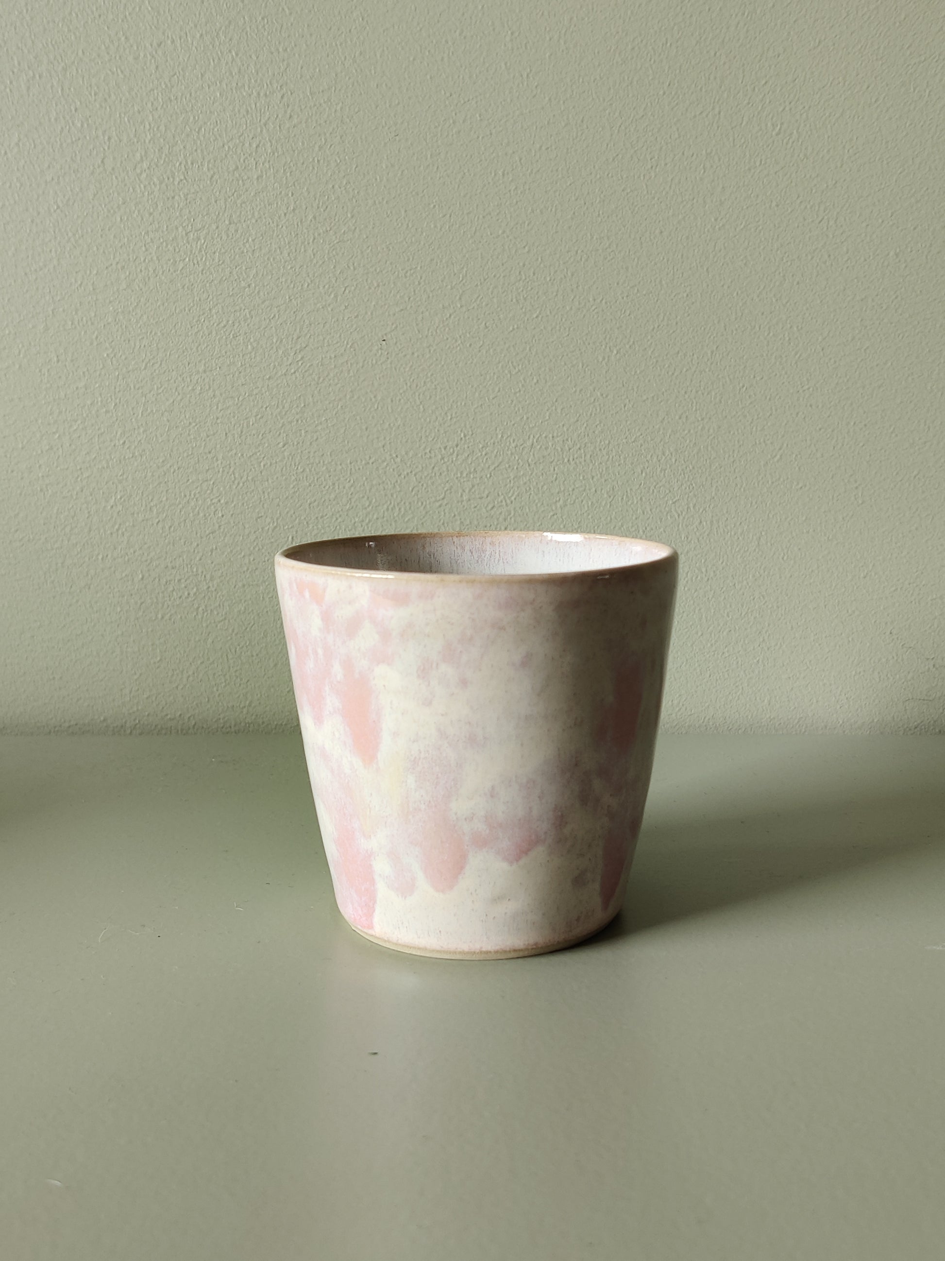 Enkel mugg drejad i vit lera. Muggen är glaserad med rosa och vit glasyr med flux, vilket ger en härlig levande vibe. Muggen rymmer cirka 3 dl.