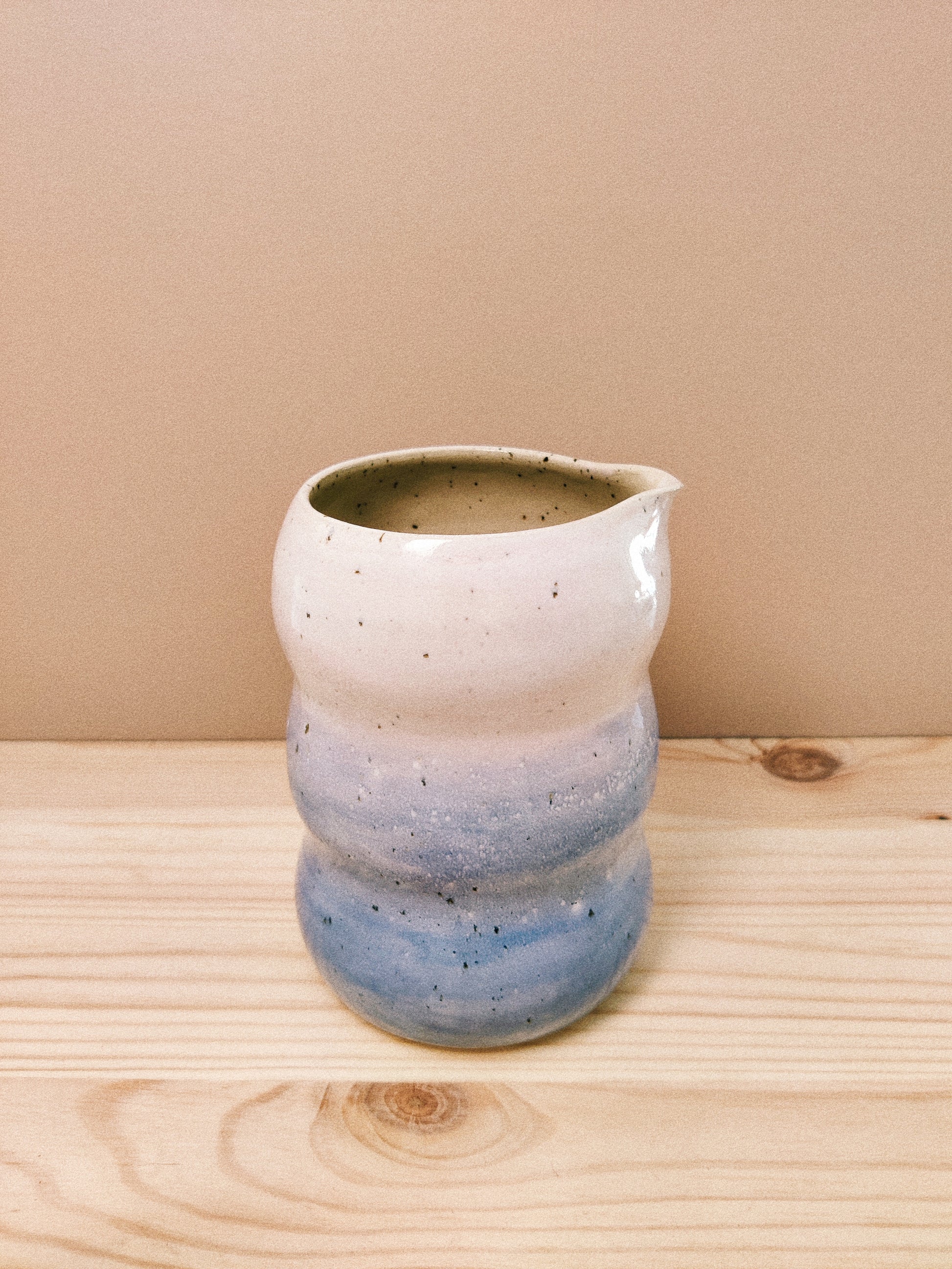 Vågig kanna drejad i vit lera med lavaprickar. Glaserad med härligt pastellig glasyr i ljust rosa, vit och blå toner. Mäter cirka 10 cm i diameter och 20 cm hög, sitter fint i handen. Bra för lite juice, vaniljsåsen eller kanske en smarrig drink?